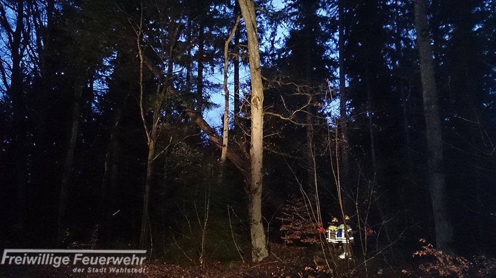 Der zuständige Forstbetrieb fällte den Baum. Die Feuerwehr unterstützte die Arbeiten und sperrte die Straße.