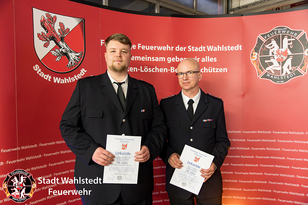 Der Oberfeuerwehrmann Moritz Schuckart wurde mit der Bandschnalle für 10-jährige Mitgliedschaft geehrt sowie der Löschmeister Stefan Sawitzki für 40-jährige Mitgliedschaft.