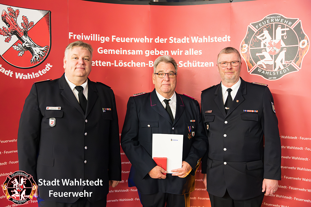 Eine besondere Überraschung hatte der Gemeindewehrführer für unseren Schriftwart und Löschmeister Günter Faßmann vorbereitet. Durch den Kreisbrandmeister Jörg Nero wurde ihm das Deutsche Feuerwehr-Ehrenkreuz in Bronze für seine langjährige unermüdliche Arbeit für die Feuerwehr Wahlstedt verliehen.