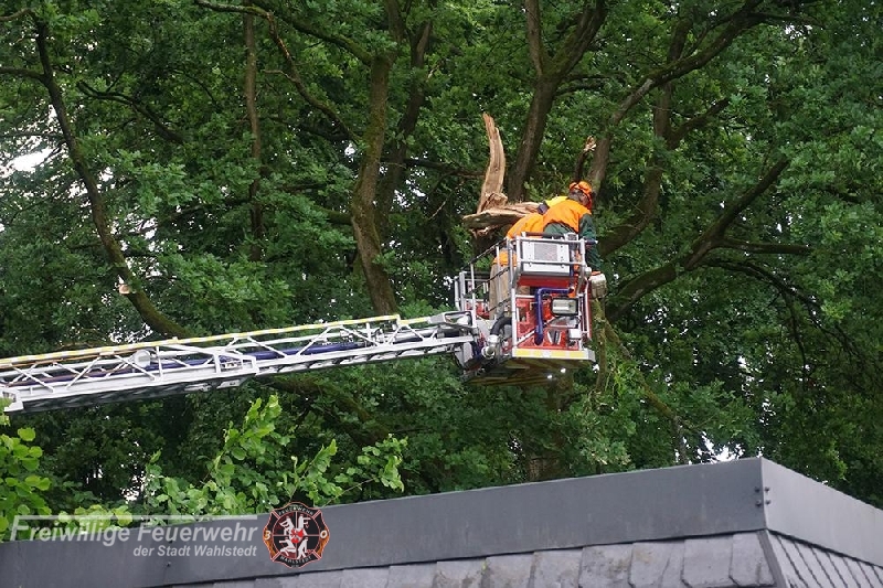 Mehrere abgebrochene starke Äste einer Eiche drohten auf ein Carport bzw. Einfamiliehaus zu fallen. Durch einen Motorsägenführer wurden aus dem Drehleiterkorb div. starke Äste abgenommen.