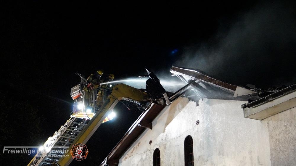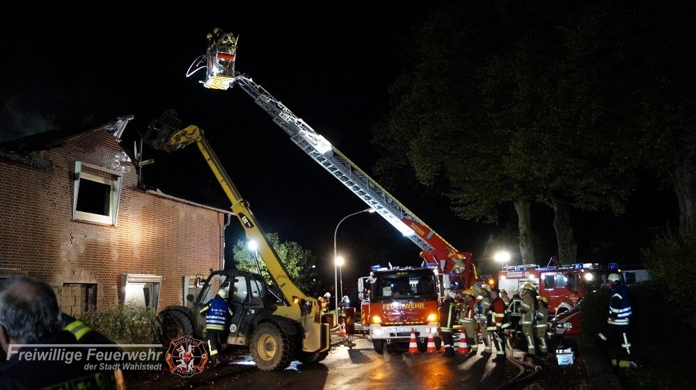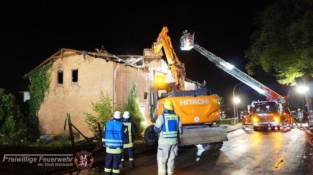Über die Drehleiter aus Wahlstedt wurde das Dach mittels Rettungssäge und Einreißhaken geöffnet und die brennende Zwischendecke abgelöscht. Wegen der stabilen Dachkonstruktion übernahmen ein Teleskoplader sowie ein Bagger das weitere auf- und abreißen des Daches. Die Korbbesatzung löschte mit einem Strahlrohr sowie dem Wasserwerfer die Glutnester ab und kontrollierte das Gebäude mit der Wärmebildkamera.