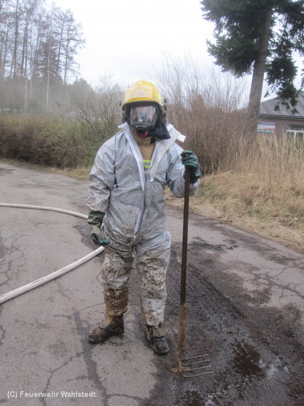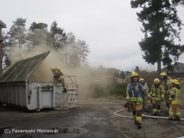 Der 365te Einsatz in diesem Jahr führte die Wahlstedter Feuerwehr ins Industriegebiet. Im Außenbereich eines Industrieunternehmen brannten in einem Container Industrieabfälle. Da dieser Abfall stark zusammen gepresst war, wurde im Verlauf des Einsatzes eine Rettungsbühne zur Brandbekämpfung aufgebaut. Um das Feuer im Container zu löschen, wurde vom Atemschutztrupp zunächst ein Strahlrohr eingesetzt, später eine Löschlanze. Um mit dem Löschwasser eine bessere Eindringtiefe in den Brandherd zu erreichen, wurde mit Netzmittel gearbeitet. Ein Atemschutzgeräteträger wurde mit einem Einmal-Anzug ausgestattet um die Brandnester auseinander zu ziehen. Da die Abfälle aus einer Produktionshalle kamen, wurden die Produktiosanlagen zusammen mit einem Mitarbeiter des Betriebes mit der Wärmebildkamera kontrolliert. Nach der Meldung "Feuer aus" wurde die Einsatzstelle an den Betreiber übergeben.
