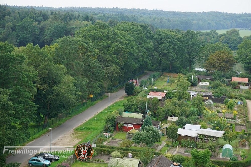 An der vorigen Einsatzstelle wurde erneut eine Rauchentwicklung mit Brandgeruch wahrgenommen. Über die Drehleiter wurde eine Erkundung von oben durchgeführt, es konnte eine leichte Rauchentwicklung in der Kleingartenanlage festgestellt werden.