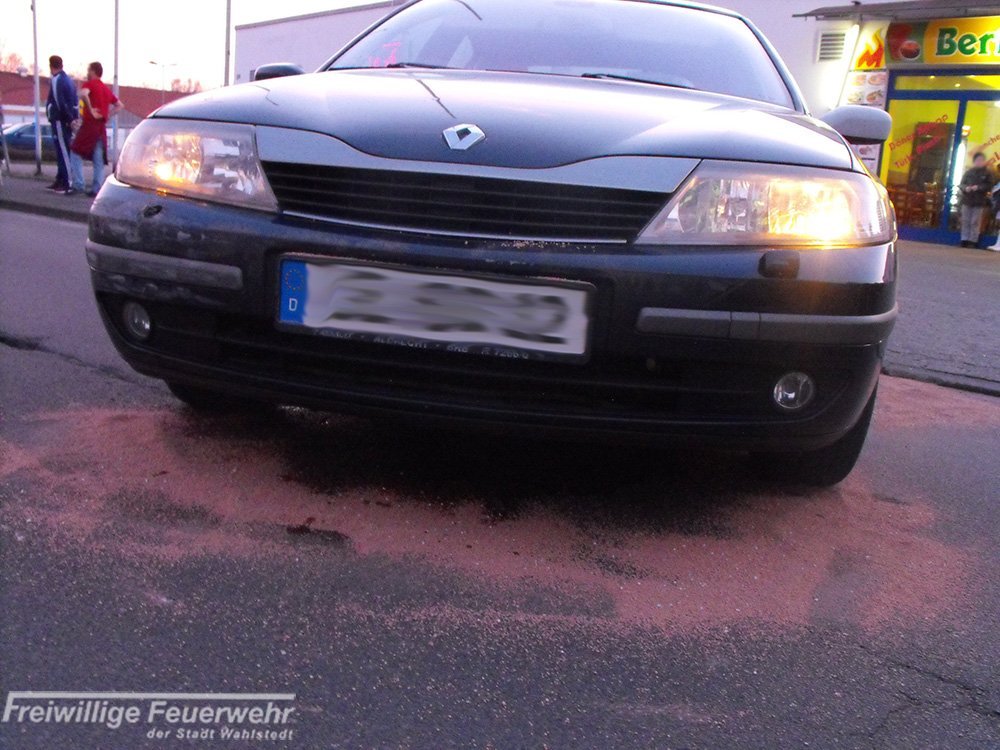 Nach einem Verkehrsunfall mit drei beteiligten Pkws liefen Betriebsmittel aus. Die Feuerwehr streute diese mit einem Kanister Ölbindemittel ab.